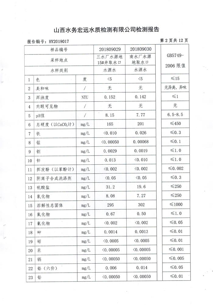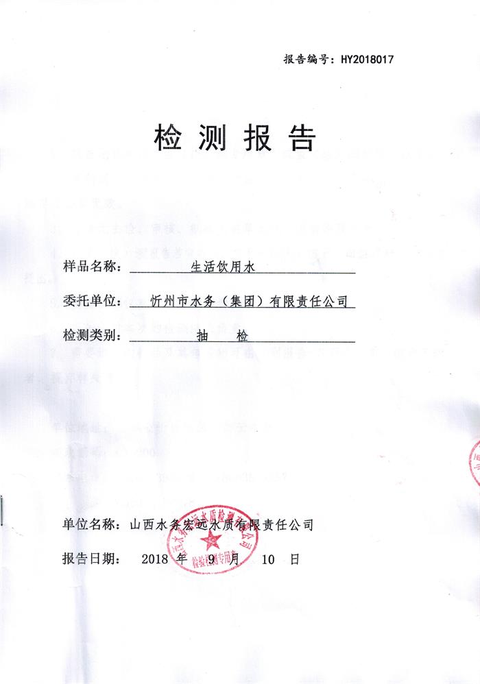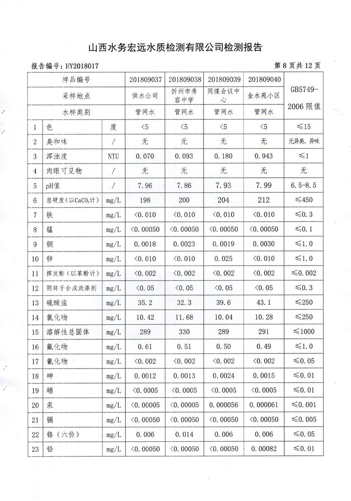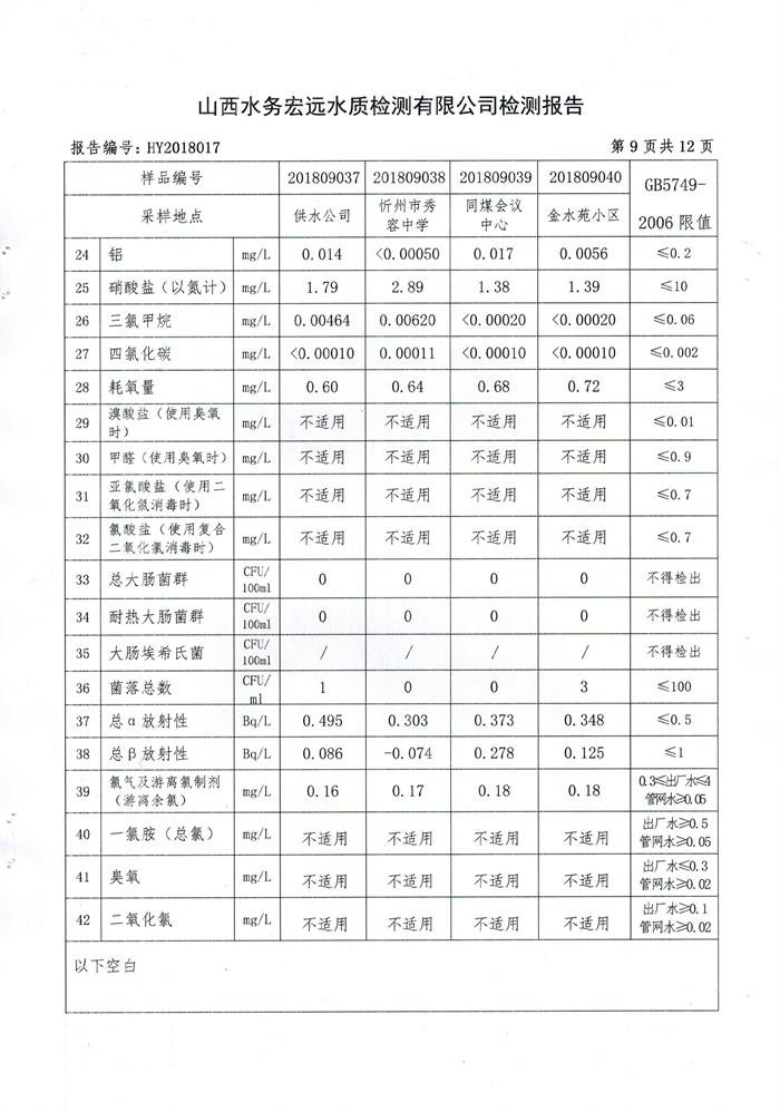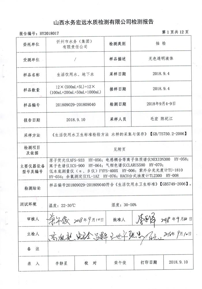 忻州城區(qū)公共供水水源水、出廠水、管網水、管網末梢水2018年9月份水質信息公示